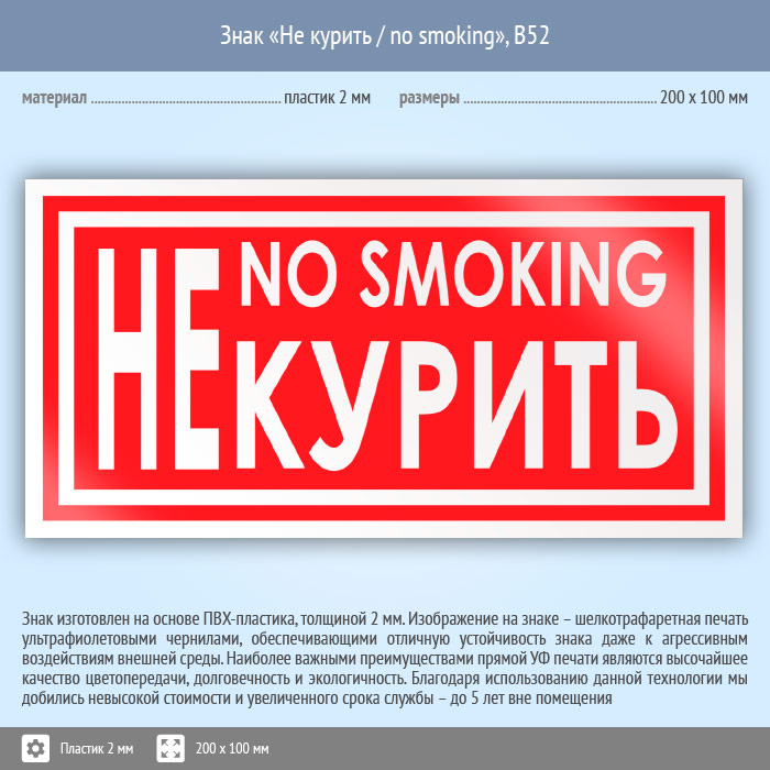 Знак «Не курить / no smoking», B52 (пластик, 200х100 мм) в Сургуте купить