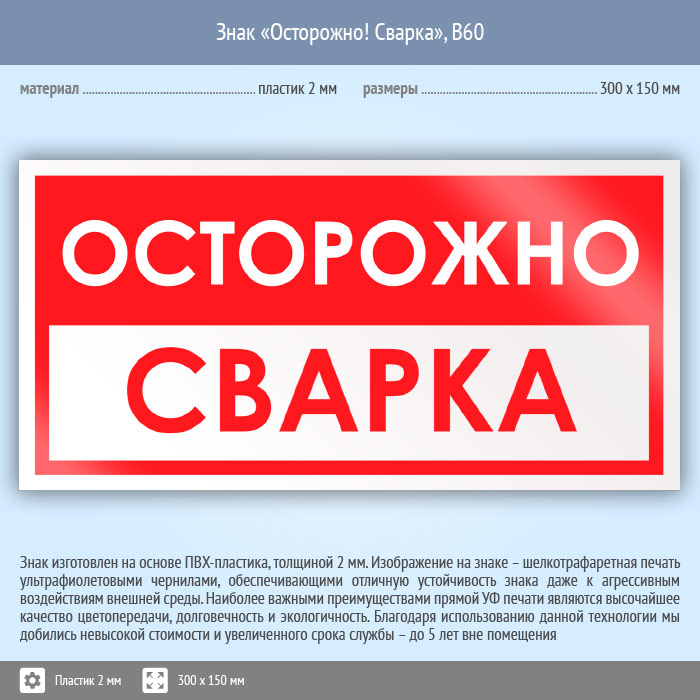 Знак «Осторожно! Сварка», B60 (пластик, 300х150 мм) в Сургуте купить