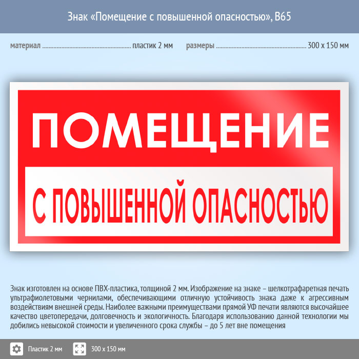 Знак «Помещение с повышенной опасностью», B65 (пластик, 300х150 мм) в Сургуте купить