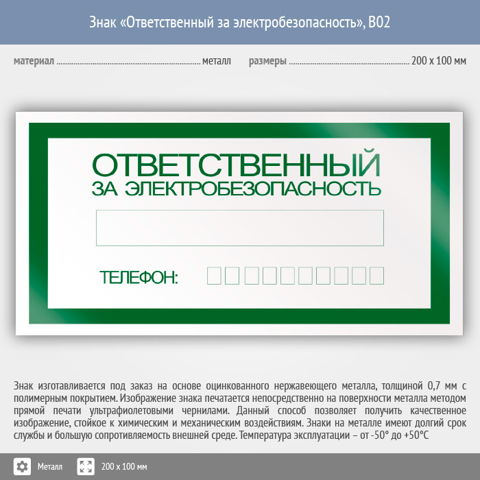 Знак «Ответственный за электробезопасность», B02 (металл, 200х100 мм) в Сургуте купить