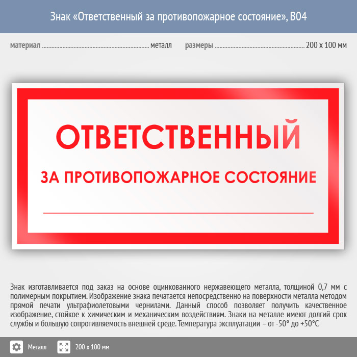 Знак «Ответственный за противопожарное состояние», B04 (металл, 200х100 мм) в Сургуте купить