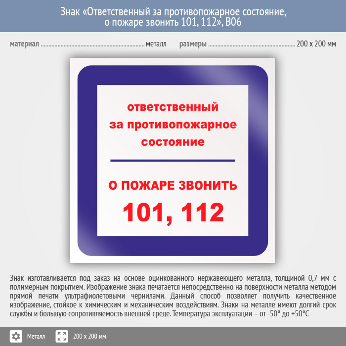 Знак «Ответственный за противопожарное состояние, о пожаре звонить 101, 112», B06 (металл, 200х200 мм) в Сургуте купить