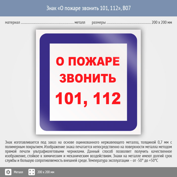 Знак «О пожаре звонить 101, 112», B07 (металл, 200х200 мм) в Сургуте купить