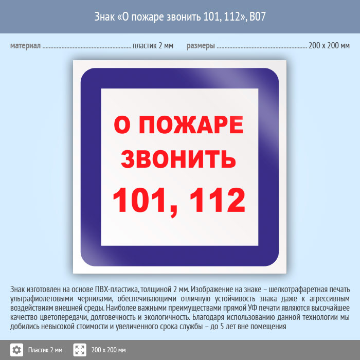 Знак «О пожаре звонить 101, 112», B07 (пластик, 200х200 мм) в Сургуте купить