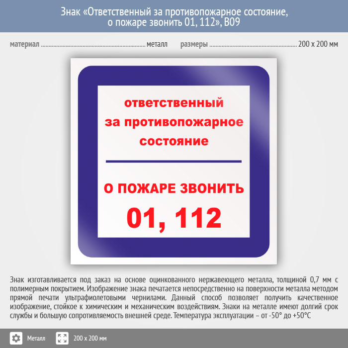 Знак «Ответственный за противопожарное состояние, о пожаре звонить 01, 112», B09 (металл, 200х200 мм) в Сургуте купить