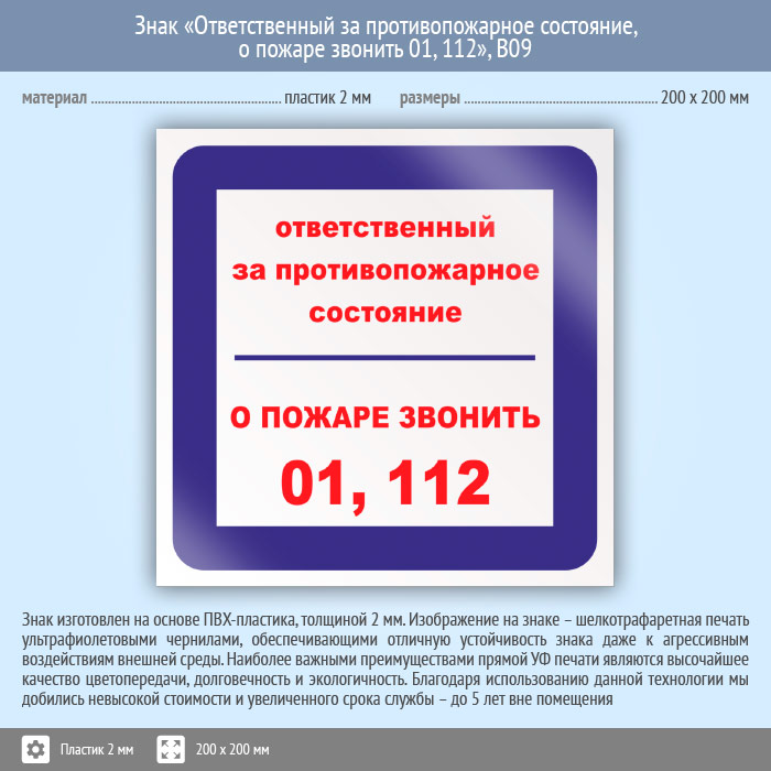 Знак «Ответственный за противопожарное состояние, о пожаре звонить 01, 112», B09 (пластик, 200х200 мм) в Сургуте купить