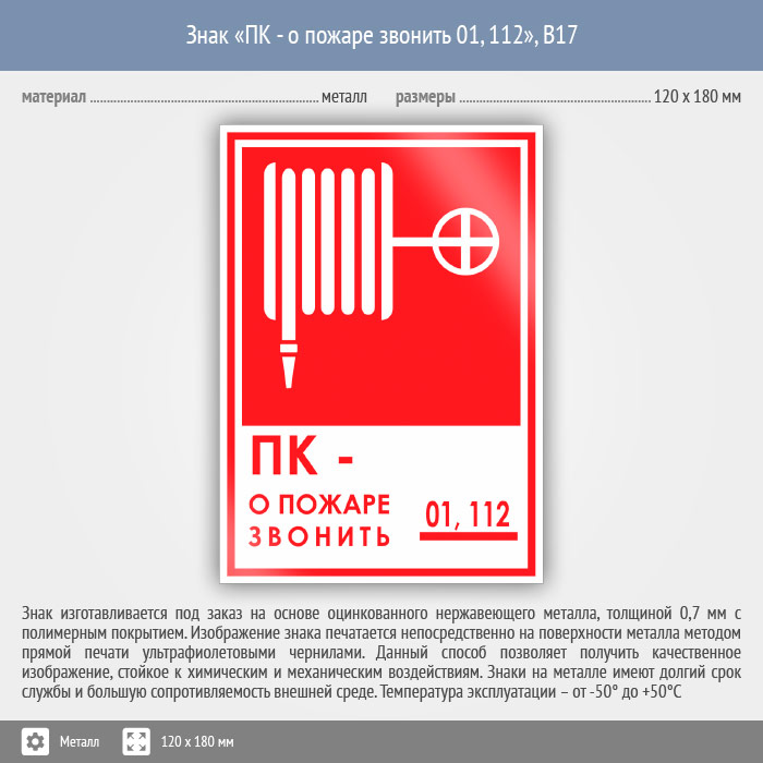 Знак «ПК - о пожаре звонить 01, 112», B17 (металл, 120х180 мм) в Сургуте купить