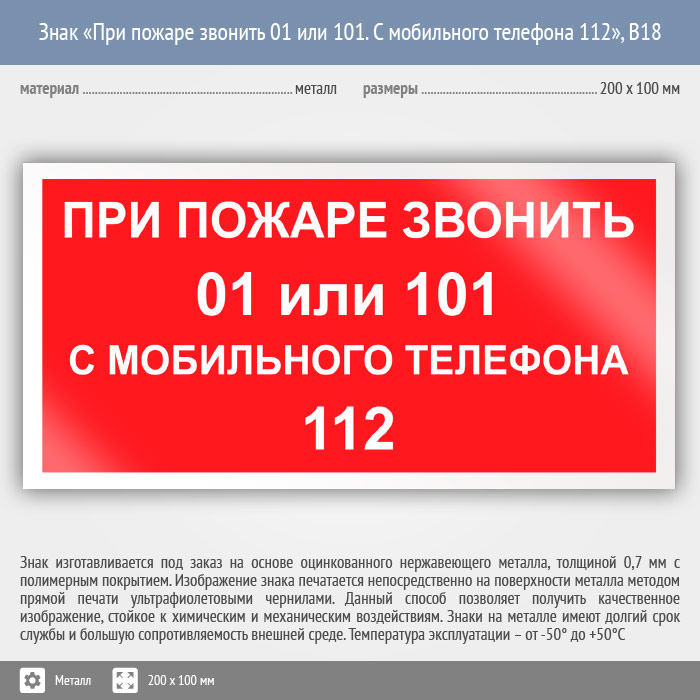 Знак «При пожаре звонить 01 или 101. С мобильного телефона 112», B18 (металл, 200х100 мм) в Сургуте купить