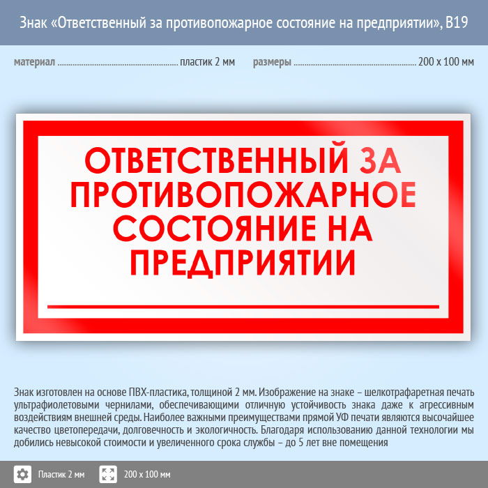 Знак «Ответственный за противопожарное состояние на предприятии», B19 (пластик, 200х100 мм) в Сургуте купить