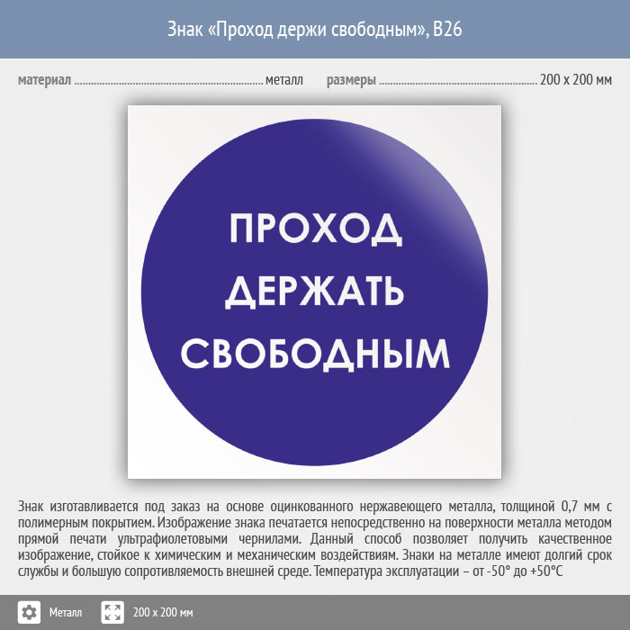 Знак «Проход держи свободным», B26 (металл, 200х200 мм) в Сургуте купить