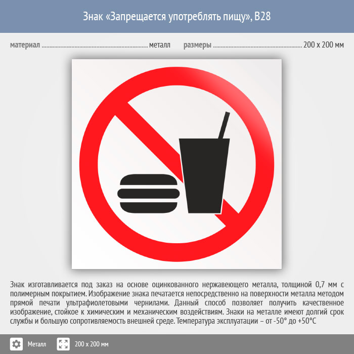 Знак «Запрещается употреблять пищу», B28 (металл, 200х200 мм) в Сургуте купить