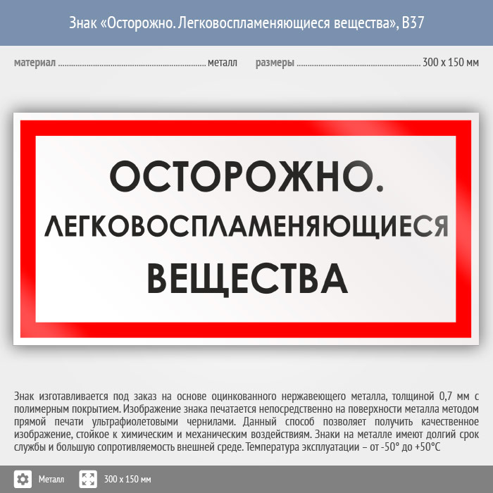 Знак «Осторожно. Легковоспламеняющиеся вещества», B37 (металл, 300х150 мм) в Сургуте купить