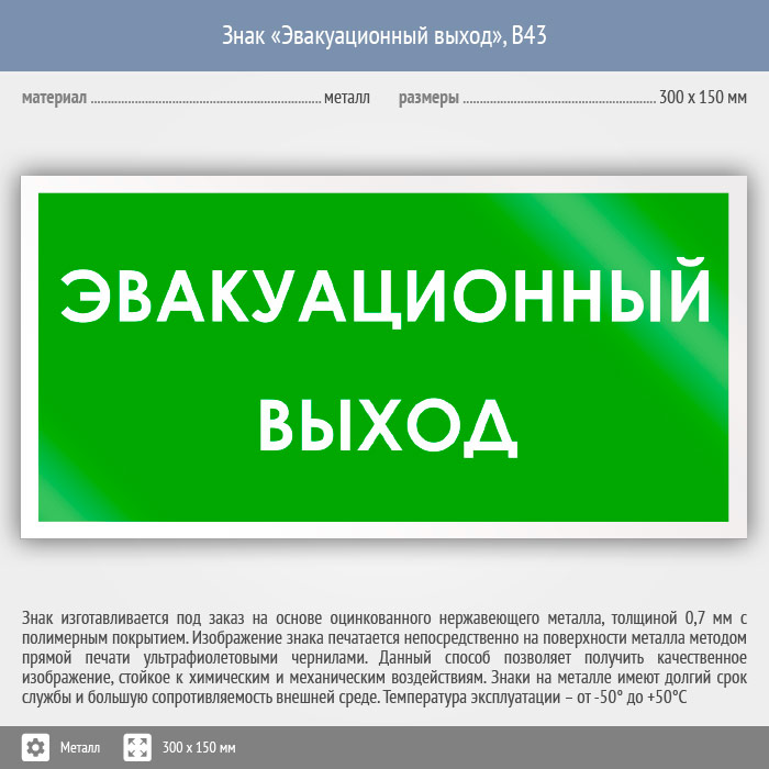 Знак «Эвакуационный выход», B43 (металл, 300х150 мм) в Сургуте купить