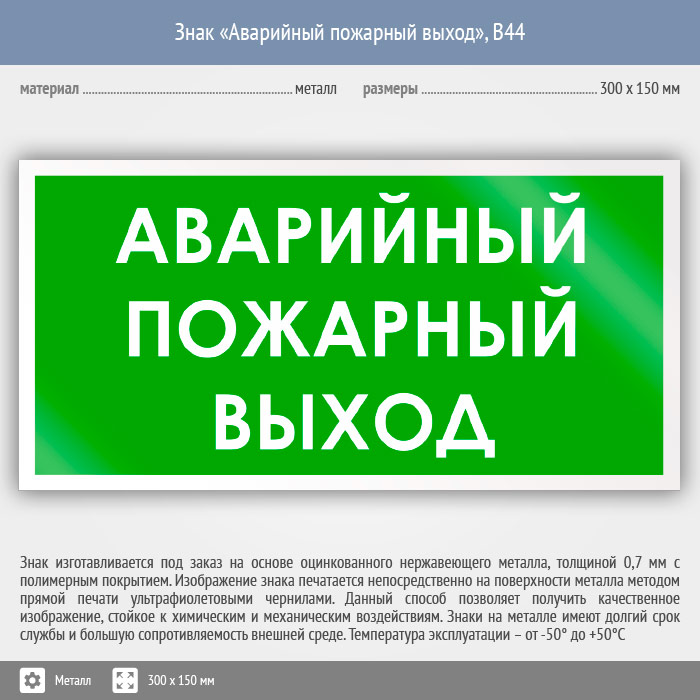 Знак «Аварийный пожарный выход», B44 (металл, 300х150 мм) в Сургуте купить