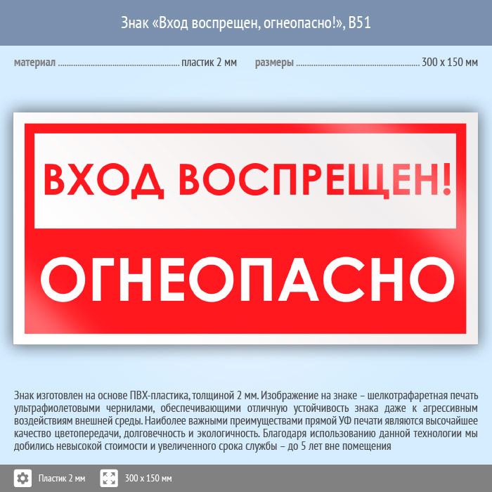 Знак «Вход воспрещен, огнеопасно!», B51 (пластик, 300х150 мм) в Сургуте купить
