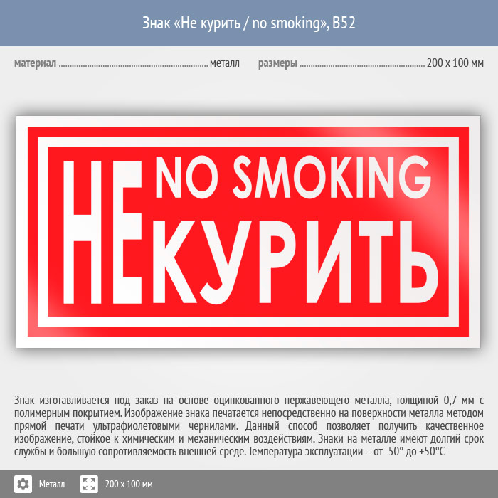 Знак «Не курить / no smoking», B52 (металл, 200х100 мм) в Сургуте купить