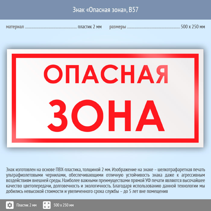 Знак «Опасная зона», B57 (пластик, 500х250 мм) в Сургуте купить