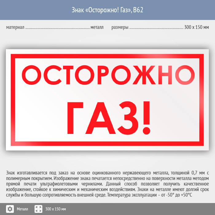 Знак «Осторожно! Газ», B62 (металл, 300х150 мм) в Сургуте купить