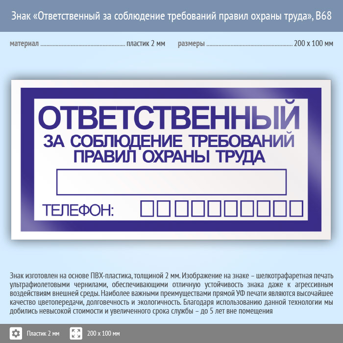 Знак «Ответственный за соблюдение требований правил охраны труда», B68 (пластик, 200х100 мм) в Сургуте купить