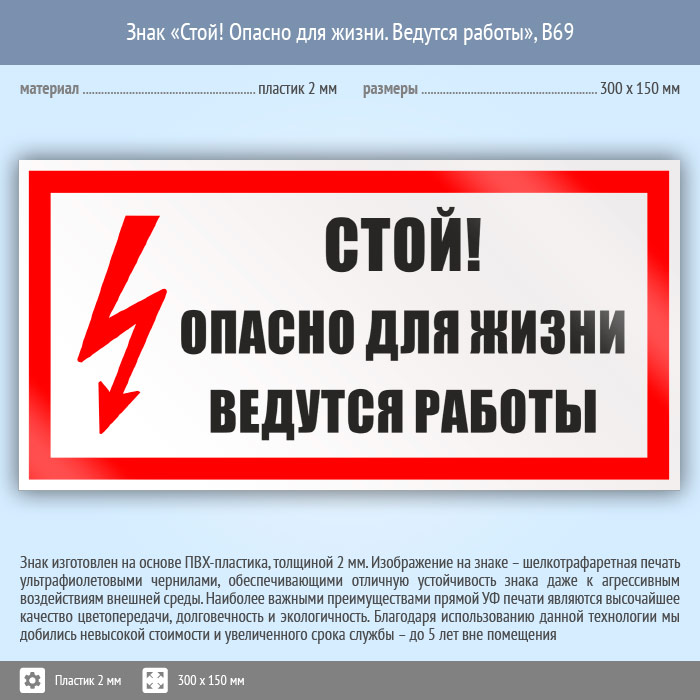 Знак «Стой! Опасно для жизни. Ведутся работы», B69 (пластик, 300х150 мм) в Сургуте купить