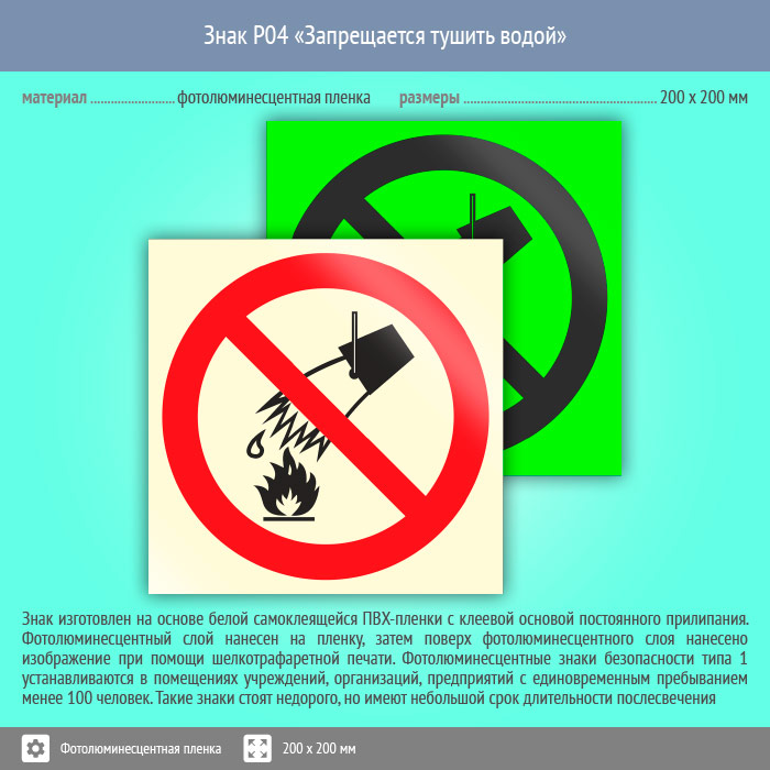 Знак P04 «Запрещается тушить водой» (фотолюминесцентная пленка, 200х200 мм) в Сургуте купить