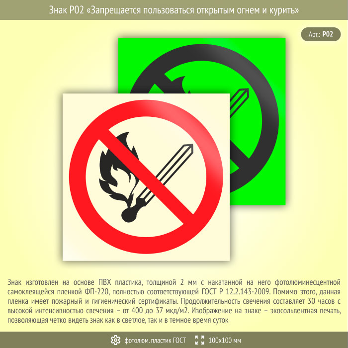 Знак P02 «Запрещается пользоваться открытым огнем и курить» (фотолюминесцентный пластик ГОСТ 34428-2018, 100х100 мм) в Сургуте купить
