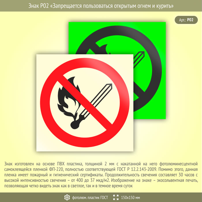 Знак P02 «Запрещается пользоваться открытым огнем и курить» (фотолюминесцентный пластик ГОСТ 34428-2018, 150х150 мм) в Сургуте купить