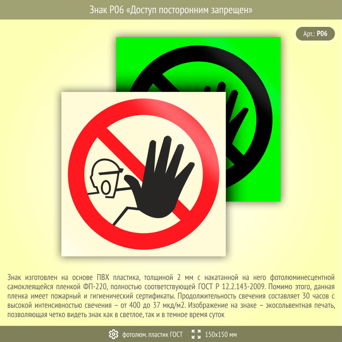 Знак P06 «Доступ посторонним запрещен» (фотолюминесцентный пластик ГОСТ 34428-2018, 150х150 мм) в Сургуте купить