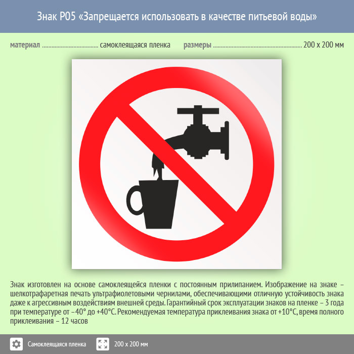 Знак P05 «Запрещается использовать в качестве питьевой воды» (пленка, 200х200 мм) в Сургуте купить