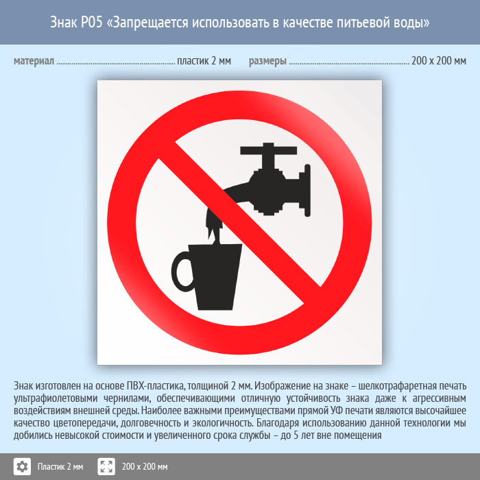 Знак P05 «Запрещается использовать в качестве питьевой воды» (пластик, 200х200 мм) в Сургуте купить