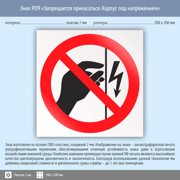 Знак P09 «Запрещается прикасаться. Корпус под напряжением» (пластик, 200х200 мм) в Сургуте купить