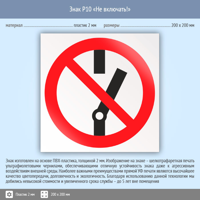 Знак P10 «Не включать!» (пластик, 200х200 мм) в Сургуте купить