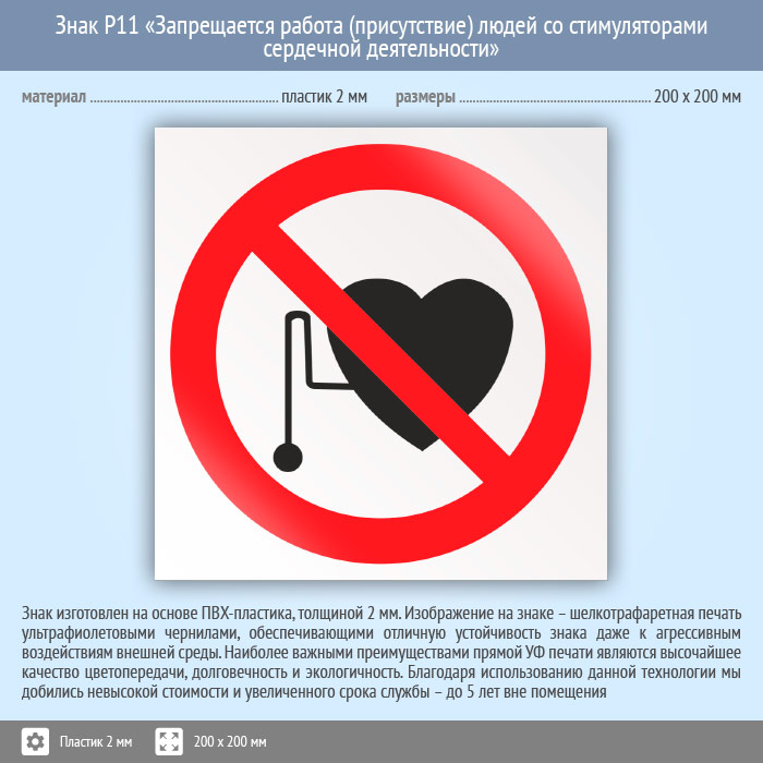 Знак P11 «Запрещается работа (присутствие) людей со стимуляторами сердечной деятельности» (пластик, 200х200 мм) в Сургуте купить