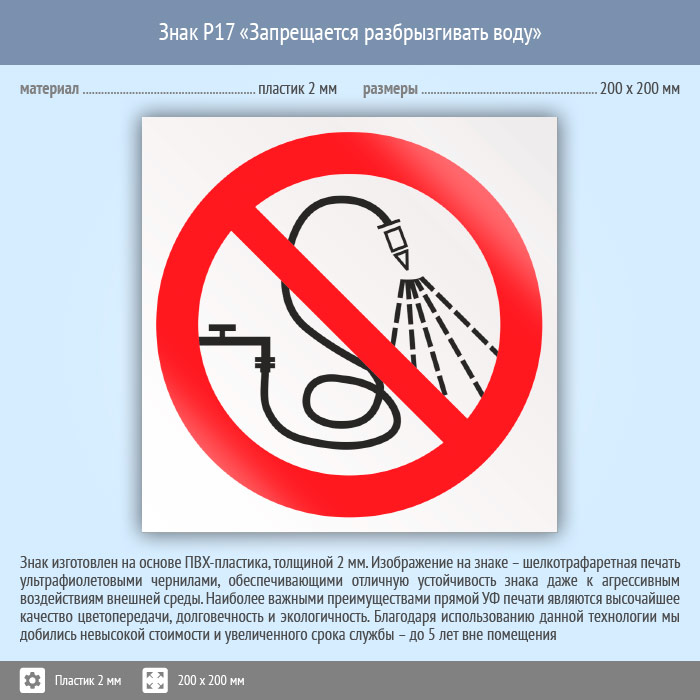 Знак P17 «Запрещается разбрызгивать воду» (пластик, 200х200 мм) в Сургуте купить