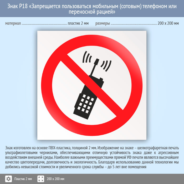 Знак P18 «Запрещается пользоваться мобильным (сотовым) телефоном или переносной рацией» (пластик, 200х200 мм) в Сургуте купить
