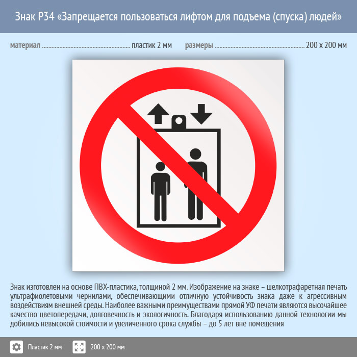 Знак P34 «Запрещается пользоваться лифтом для подъема (спуска) людей» (пластик, 200х200 мм) в Сургуте купить