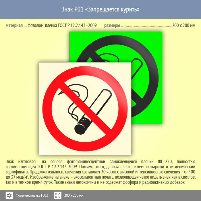Знак P01 «Запрещается курить» (фотолюминесцентная пленка ГОСТ 34428-2018, 200х200 мм) в Сургуте купить