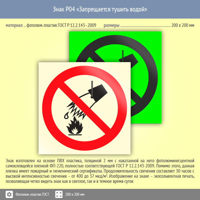 Знак P04 «Запрещается тушить водой» (фотолюминесцентный пластик ГОСТ 34428-2018, 200х200 мм) в Сургуте купить