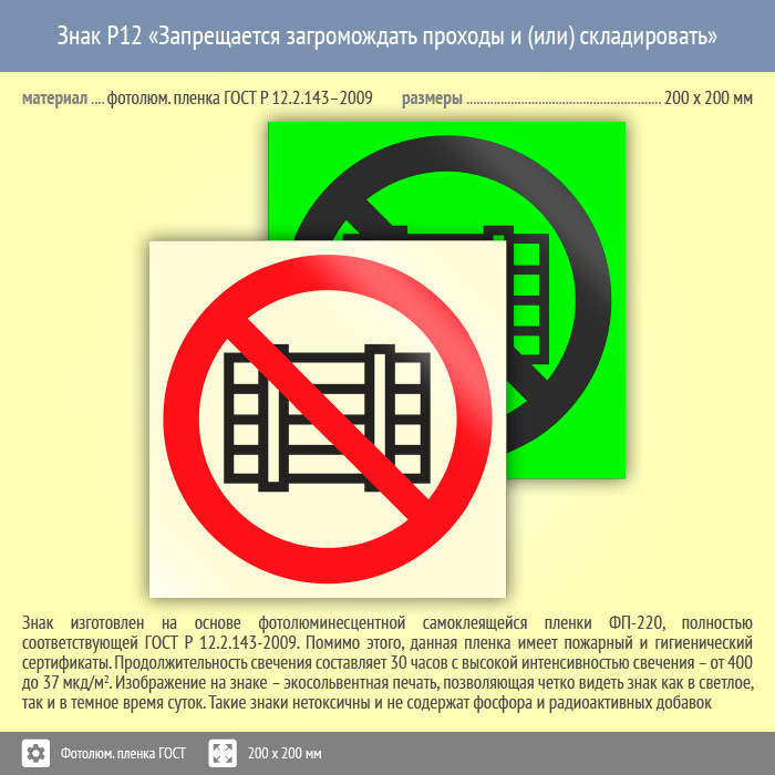 Знак P12 «Запрещается загромождать проходы и (или) складировать» (фотолюминесцентная пленка ГОСТ 34428-2018, 200х200 мм) в Сургуте купить
