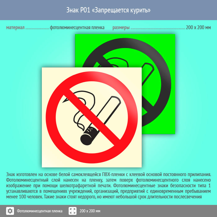 Знак P01 «Запрещается курить» (фотолюминесцентная пленка, 200х200 мм) в Сургуте купить