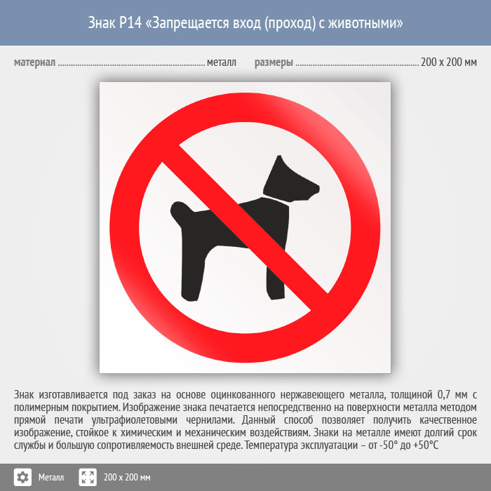 Знак P14 «Запрещается вход (проход) с животными» (металл, 200х200 мм) в Сургуте купить