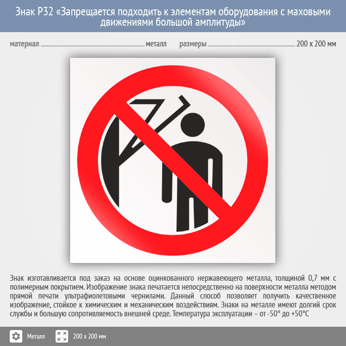 Знак P32 «Запрещается подходить к элементам оборудования с маховыми движениями большой амплитуды» (металл, 200х200 мм) в Сургуте купить