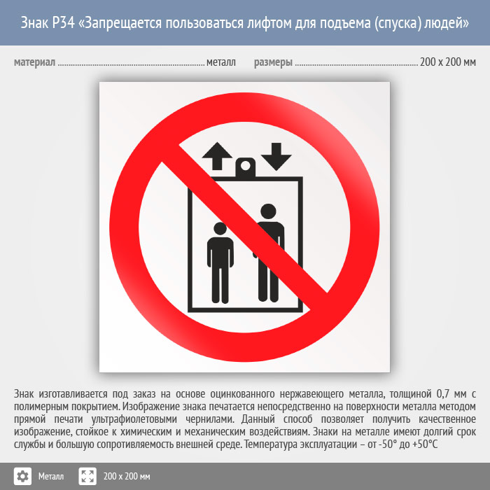 Знак P34 «Запрещается пользоваться лифтом для подъема (спуска) людей» (металл, 200х200 мм) в Сургуте купить