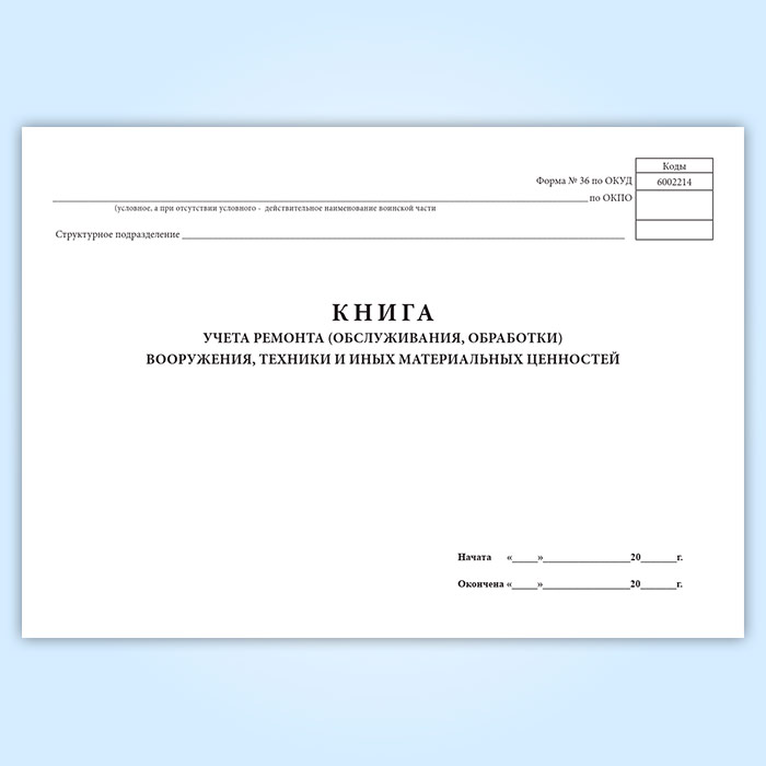 Книга учета ремонта (обслуживания, обработки) вооружения, техники и иных материальных ценностей (форма 36) в Сургуте купить