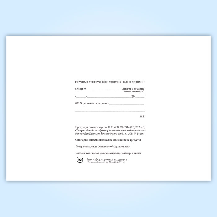 Вы получаете печатную продукцию прошнурованной и c местом для вашей печати в соответствии с действующими нормативными документами:
