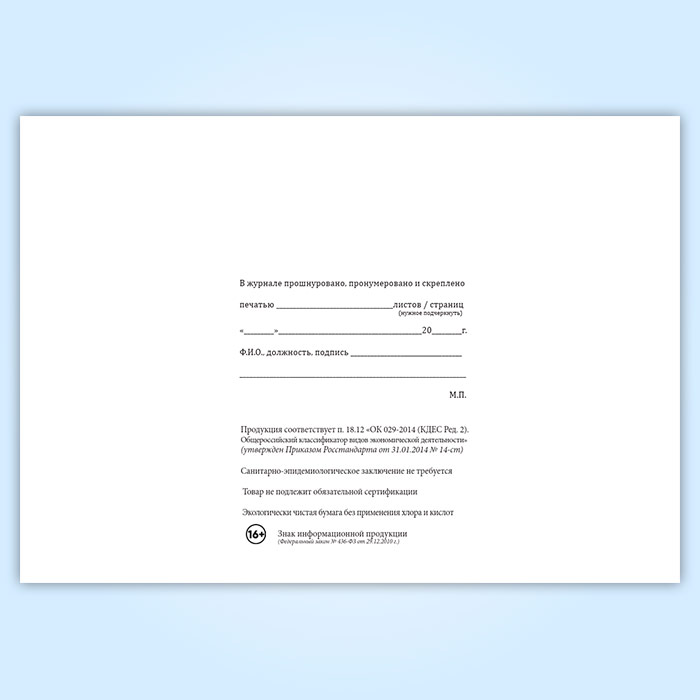 Вы получаете печатную продукцию прошнурованной и c местом для вашей печати в соответствии с действующими нормативными документами:
