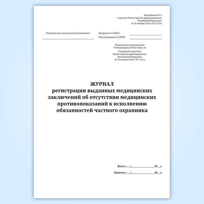 Журнал регистрации выданных медицинских заключений об отсутствии медицинских противопоказаний к исполнению обязанностей частного охранника (учетная форма № 002-ЧО/у-10) в Сургуте купить