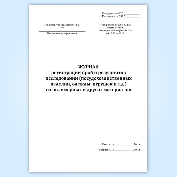 Журнал регистрации проб и результатов исследований (посудохозяйственных изделий, одежды, игрушек и т.д.) из полимерных и других материалов (форма № 338-у) в Сургуте купить