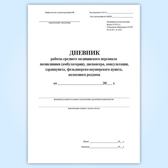 Дневник работы среднего медицинского персонала поликлиники (амбулатории), диспансера, консультации, здравпункта, фельдшерско-акушерского пункта, колхозного роддома (форма 039-1/у) в Сургуте купить