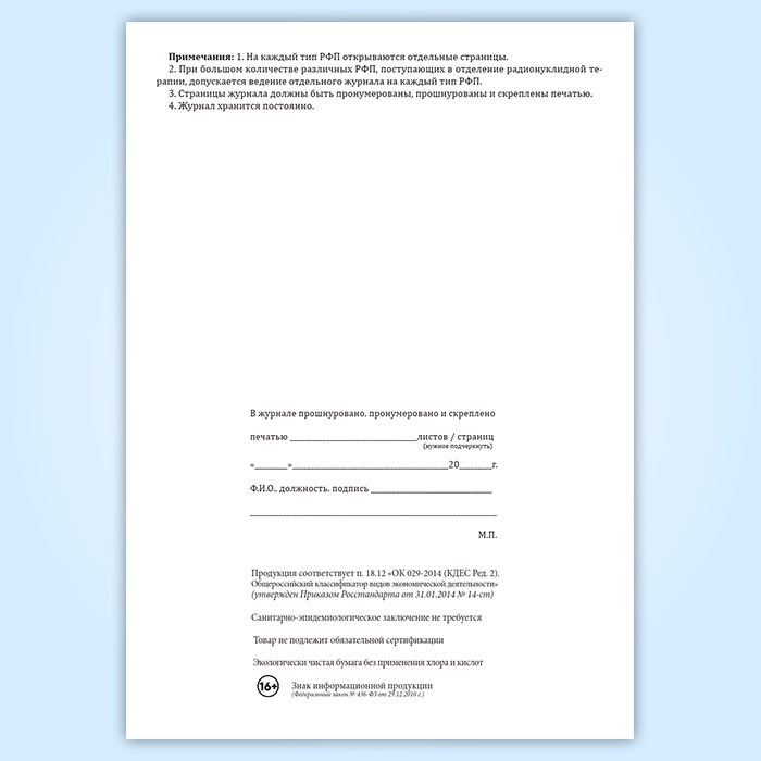 Приходно-расходный журнал учета радиофармпрепаратов, поступающих в подразделение радионуклидной терапии в готовом виде для непосредственного введения в организм пациента в Сургуте купить